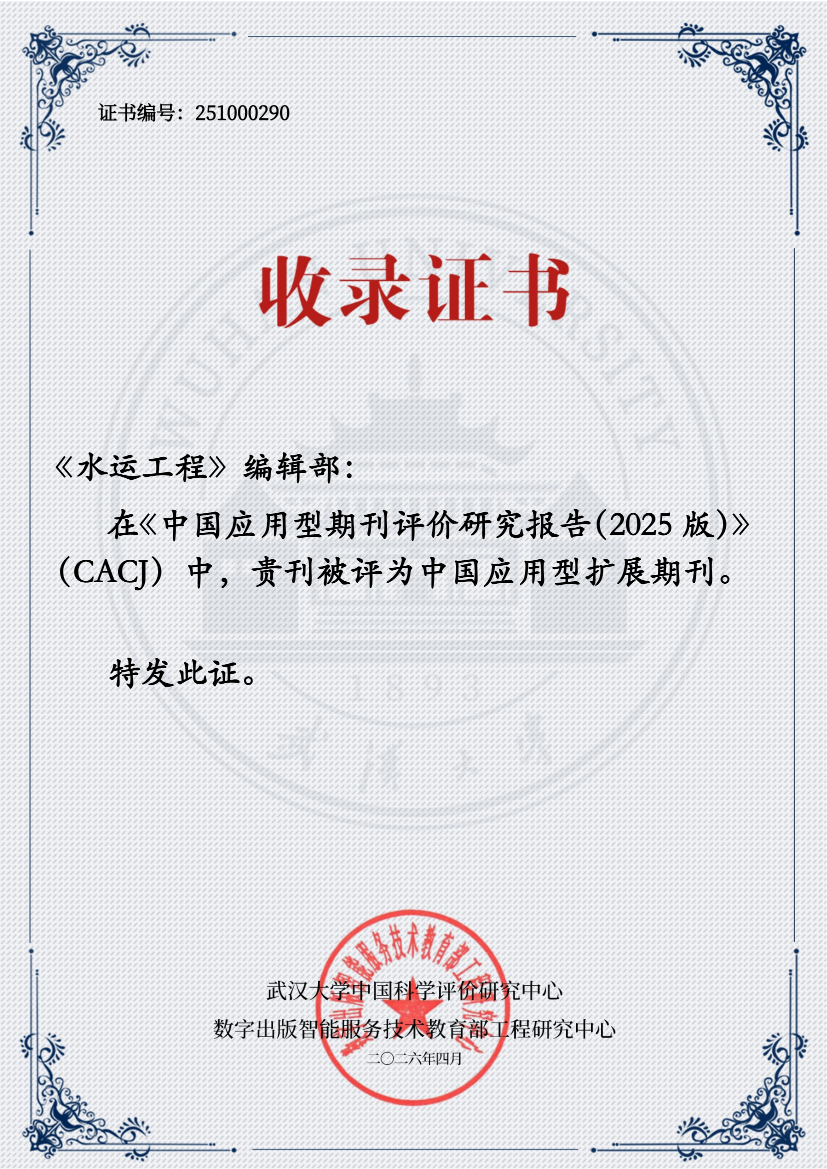 《水运工程》杂志入编《中国应用型期刊评价研究报告(2025版)》